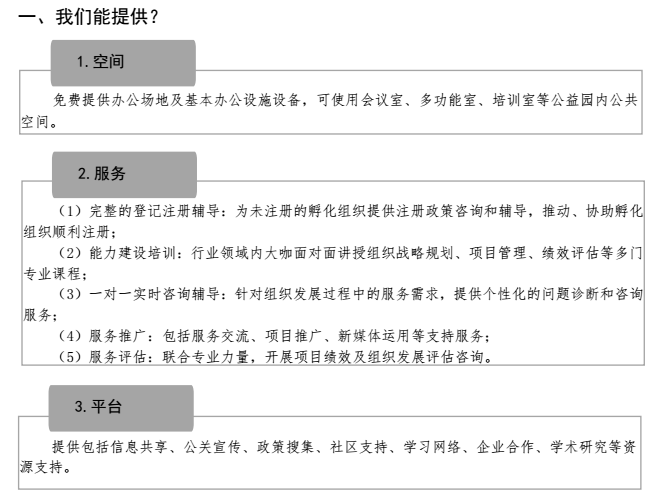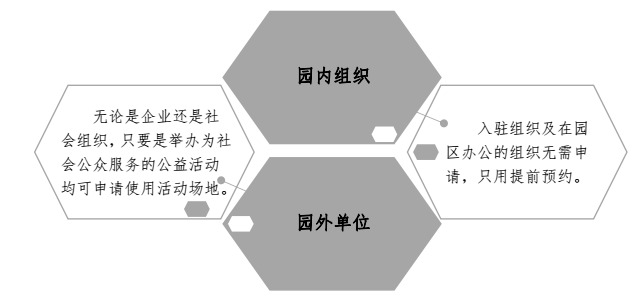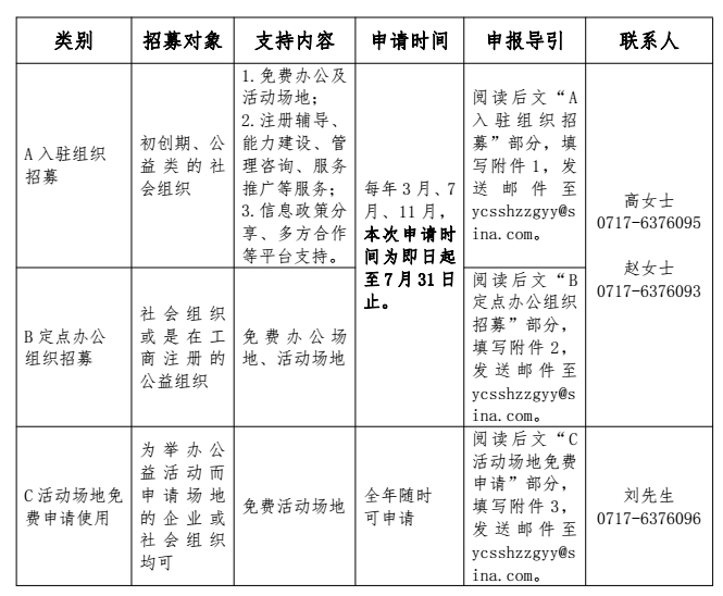 为了给更多热心公益的组织提供服务,今年的招募在以往只招入驻组织的基础上,我们增设了定点办公组织的招募及活动场地的免费申请。所以无论你是个人还是企业,无论你的公益梦想是大还是小,无论你的团队是高大上还是草根,只要你有一颗公益的心,我们都欢迎你的加入,大家可依据自身需求及条件选择以下表格中A、B、C三类中的一类进行申请。