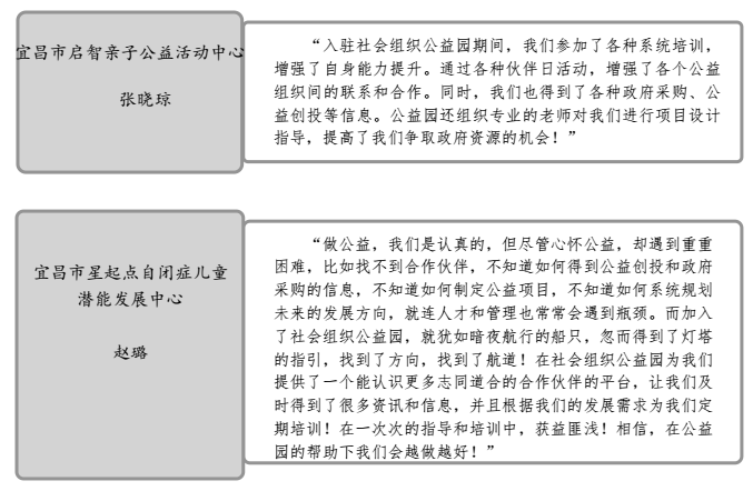 宜昌市社会组织公益园在宜昌市民政局及宜昌市伍家岗区委区政府的指导和支持下,于2015年9月正式运行,现由宜昌市汇众社会公益促进中心运营管理,武汉恩派社会创新发展中心提供技术支持。公益园位于宜昌市伍家岗区合益路88号,建设面积1500多平方米,基础设施完善,设有办公区、活动区、成果展示区等多个功能区域,是一个融合政府、企业、金融机构、社会组织、民间社团等多方资源,集公益理念倡导、社会组织培育、能力建设提升、社会组织评估、社会组织信息交流、社会工作人才实践、社会组织成果展示、公益资源共享、社会组织政策咨询和社会组织集中监督十大功能于一体的综合性支持、研发及服务平台。成立近两年来,公益园共计培育孵化社会组织25家,指导4家完成登记注册;指导园内11家入驻组织共计获取78万项目资金;举办、承办或协办了宜昌市社会组织公益园首届项目征集及评选活动,宜昌市首届及第二届社区公益服务创投大赛等多项活动。