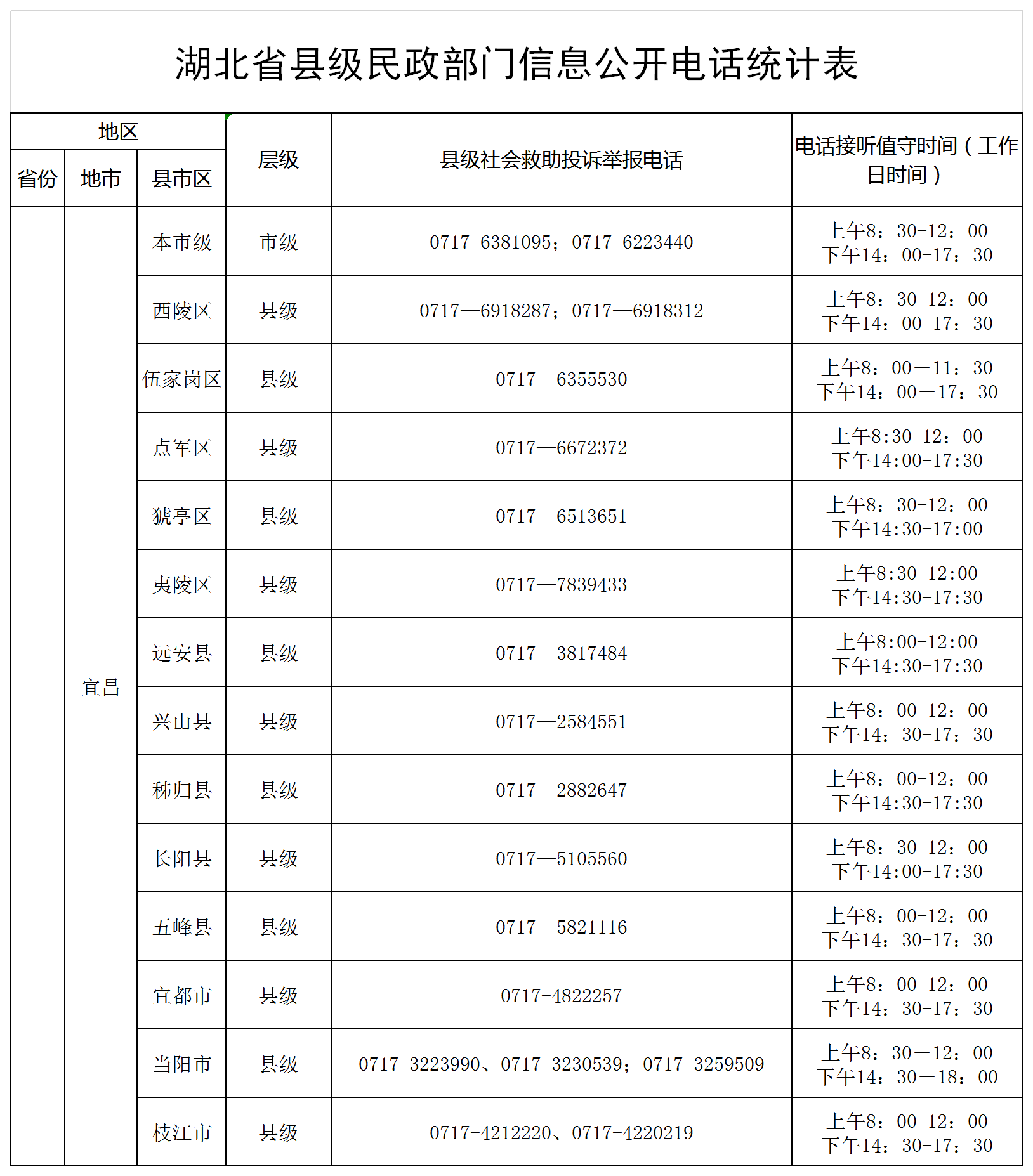 湖北省县级民政部门信息公开电话统计表