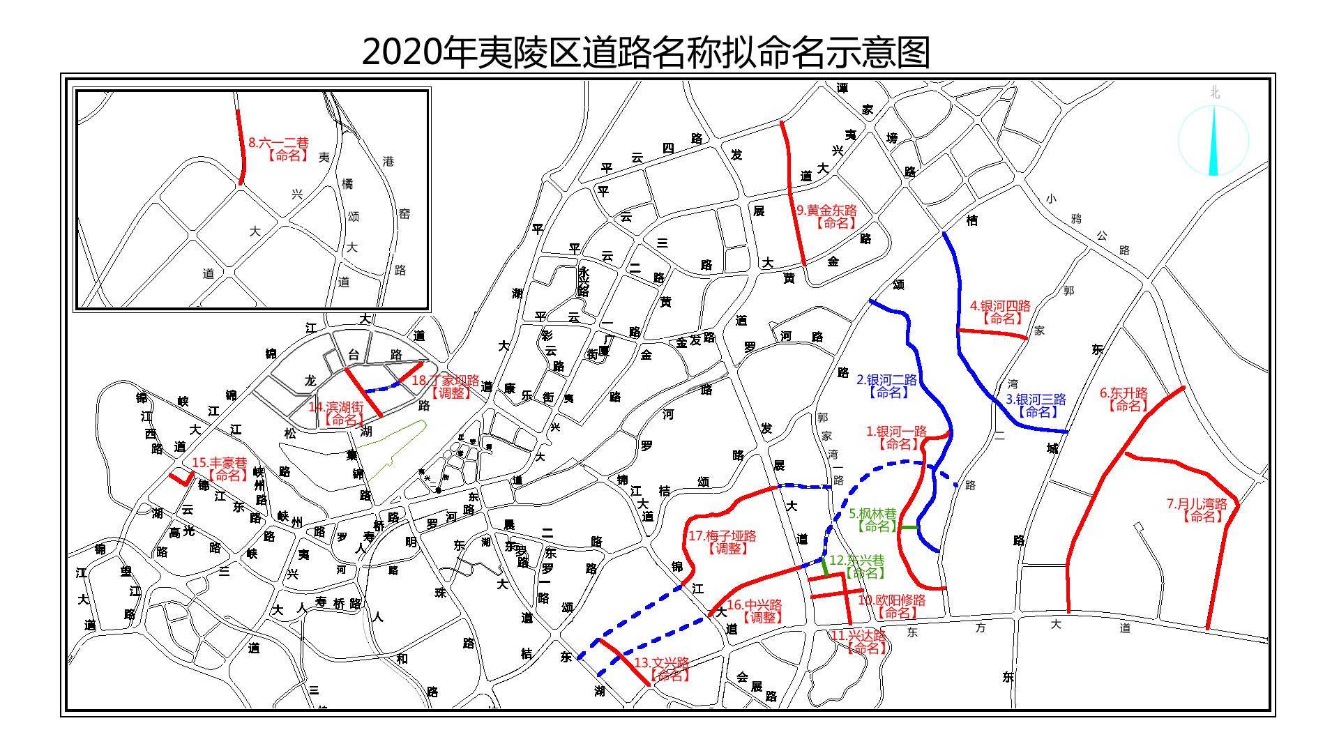 为服务宜昌城市建设,提升城市地名文化内涵,规范城区地名管理工作,根据国务院《地名管理条例》、《湖北省地名管理办法》和《宜昌市地名管理实施办法》的规定,对2020年城区申报命名的道路通过专家评审、广泛征求各方面意见和论证会充分论证,报经市人民政府批准,决定对23条道路进行命名,对9条道路调整起止点,对1条道路销名。现予以公告,请社会各单位、组织正确使用。