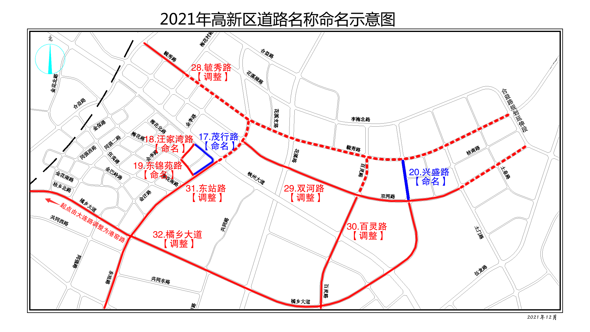 橘乡大道 :港窑路至双河路(调整起点),保持道路完整性。