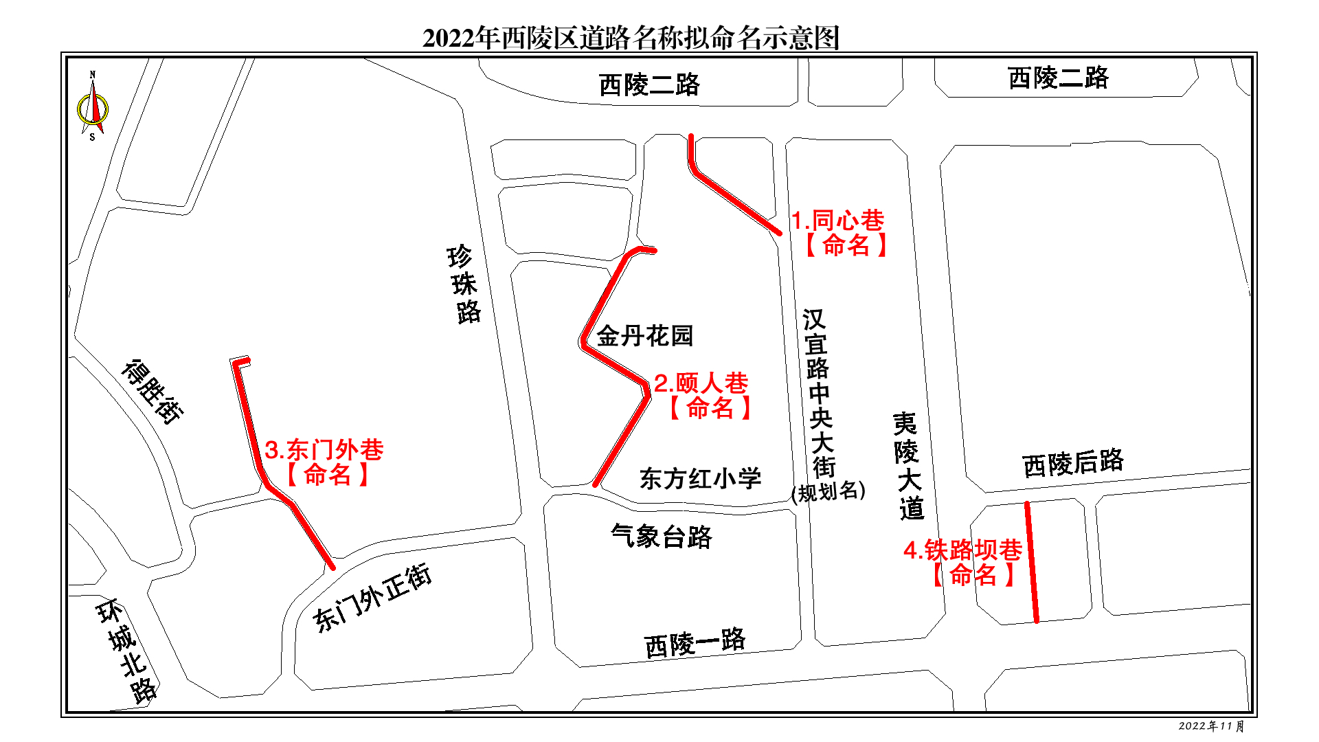 同心巷:西陵二路至汉宜路中央大街(规划名),寓意同心协力、共同缔造和谐社区。