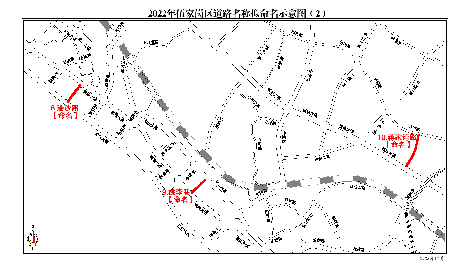 十里红路:起点江南大道,止点由惠科路调整为长江铝业,保持道路完整性。