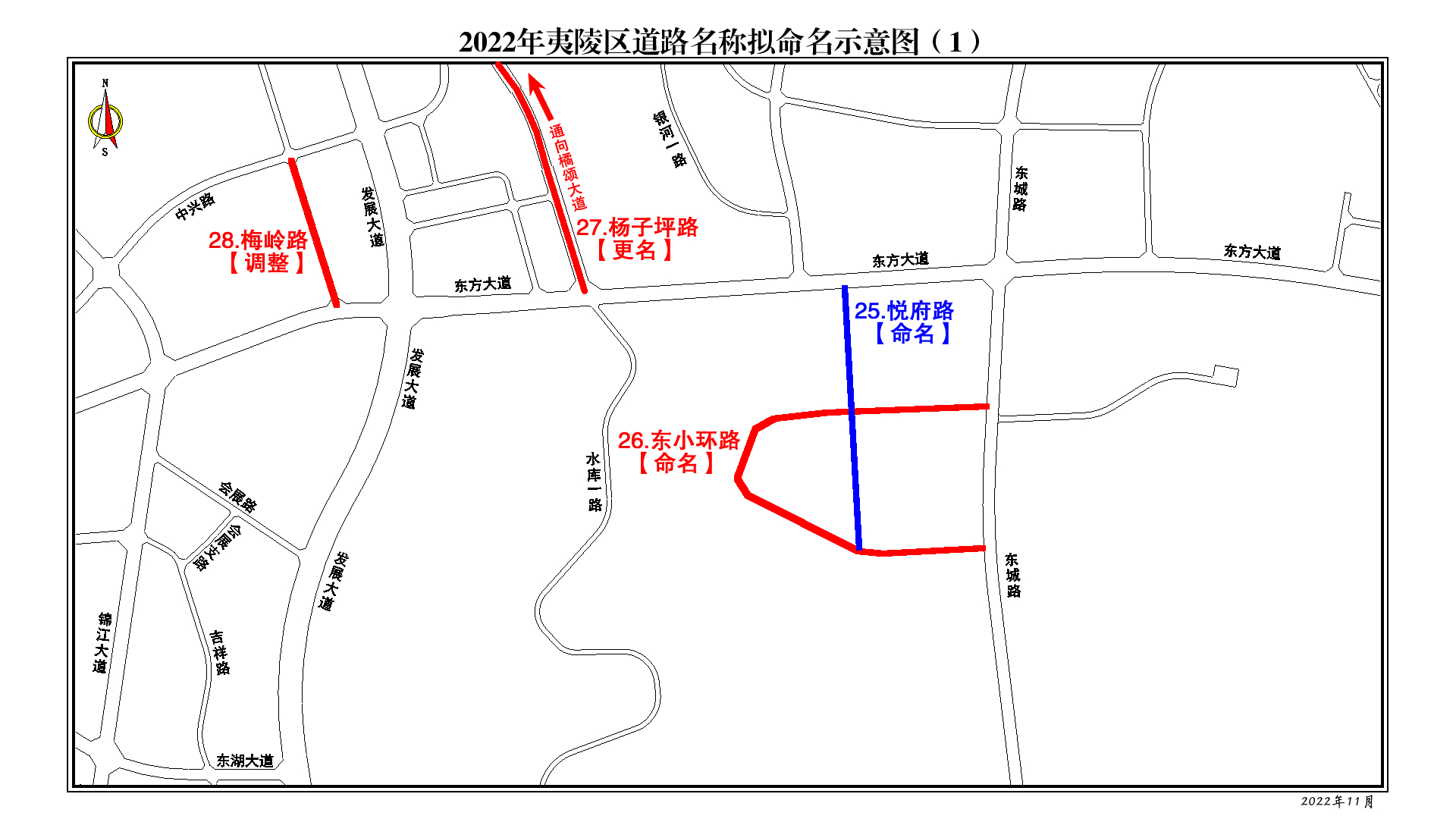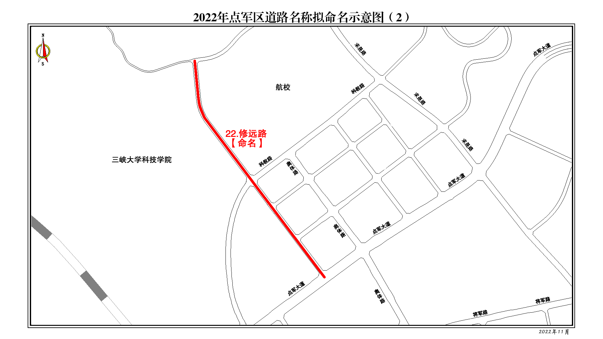 为服务宜昌城市建设,提升城市地名文化内涵,规范城区地名管理工作,根据国务院《地名管理条例》、《湖北省地名管理办法》等规定,经专家评审、广泛征求各方意见、论证会充分论证,报经市人民政府批准,决定对城区2022年申报的30条道路进行命名(更名、销名)。现予以公告,请社会各单位、组织正确使用。