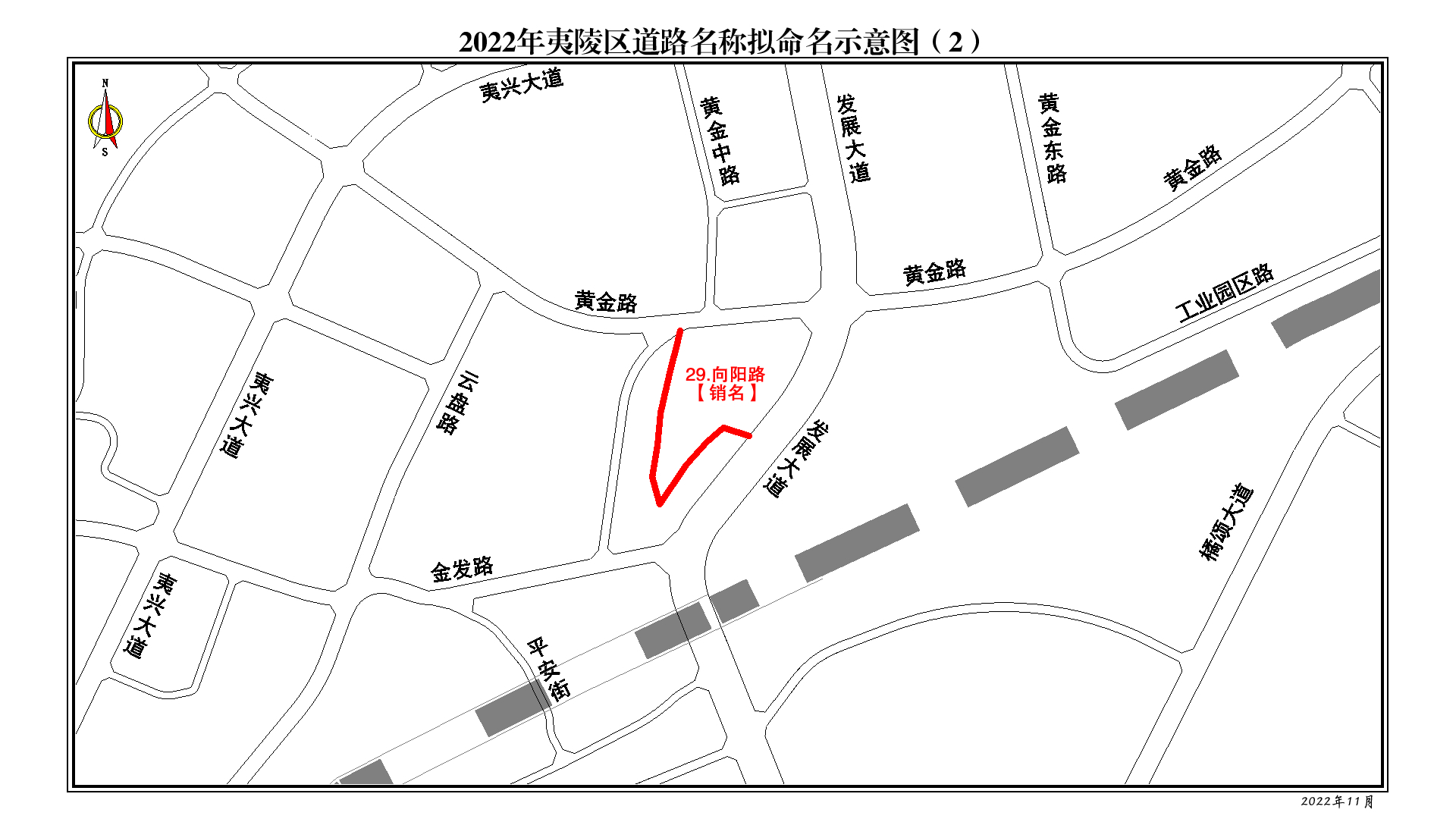向阳路:黄金路(烟厂仓库)至七里岗路(铁路),拆迁后此地重新规划建设,原向阳路消失。