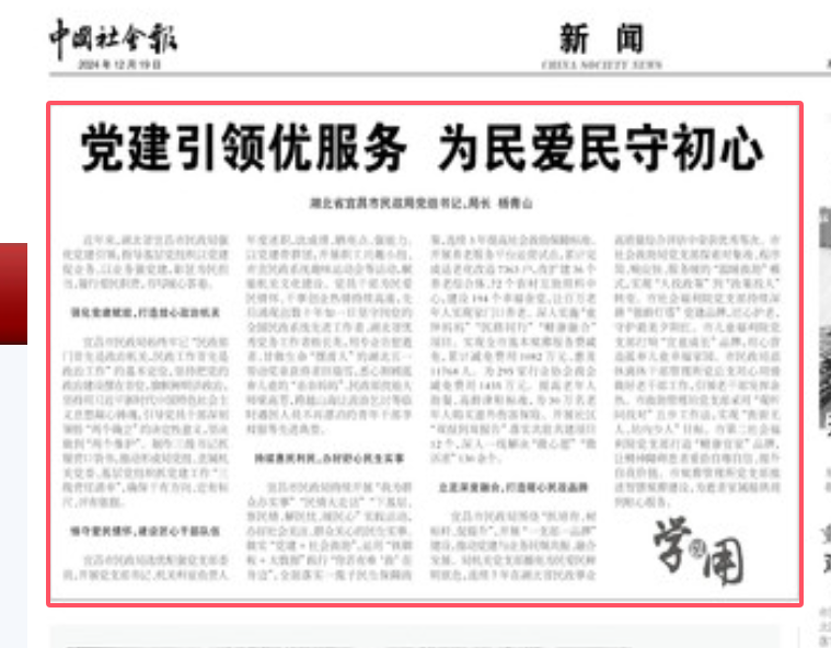 近年来,湖北省宜昌市民政局强化党建引领,指导基层党组织以党建促业务、以业务强党建,彰显为民担当,履行爱民职责,书写暖心答卷。