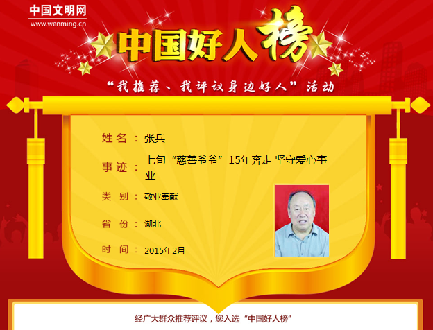 宜昌七旬慈善爷爷张兵荣登“中国好人榜”