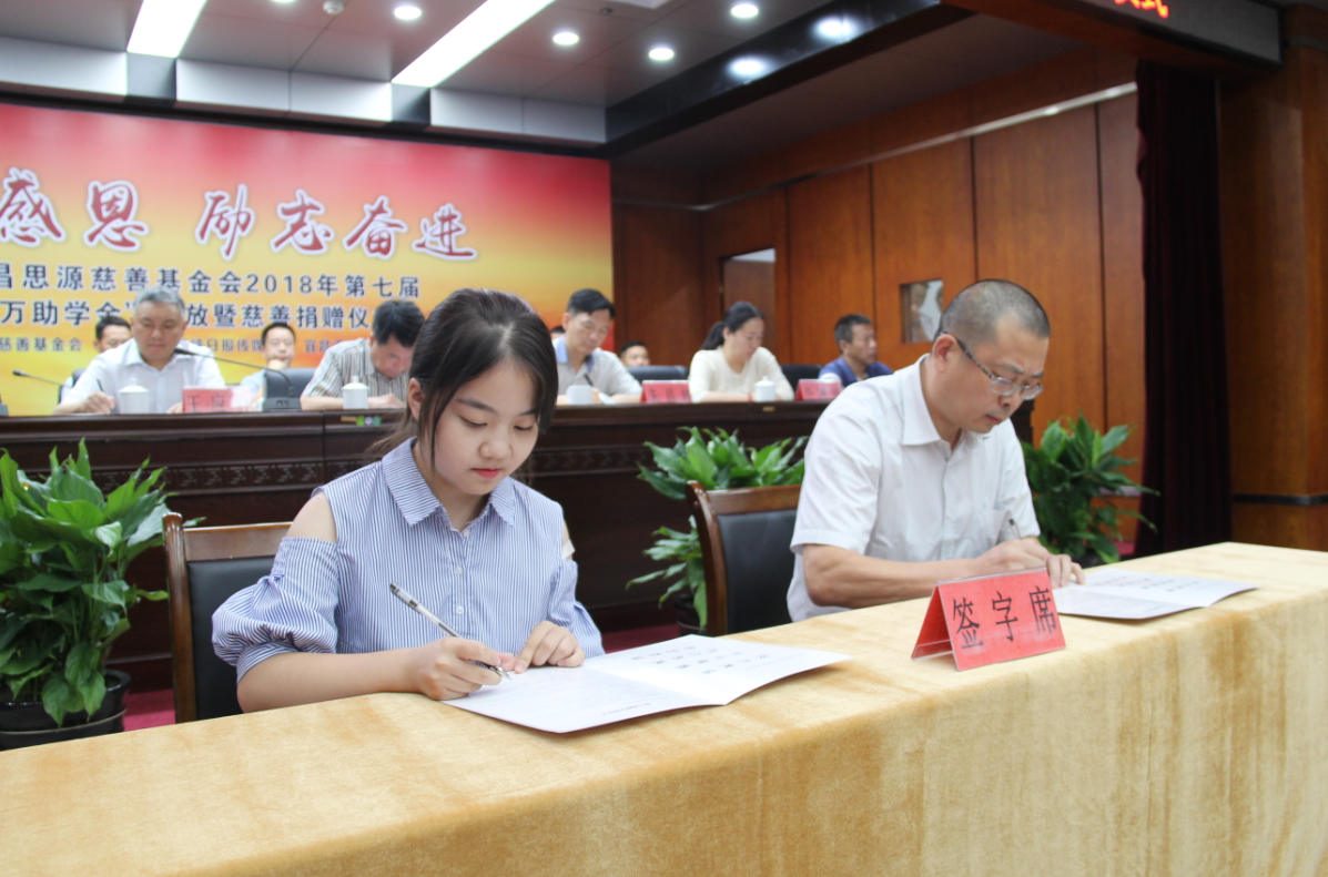 捐赠仪式上,受助生代表谢雨欣与湖北省宜昌思源慈善基金会副理事长、鑫鼎集团副董事长何建刚签订助学协议。受助学生代表李涵表示:“当我们圆梦之时,就是我们的奋发之始。我们一定常怀感恩之心,永葆进取之心,努力学习、励志奋进,以实际行动回报社会,实现人生的真正价值。”