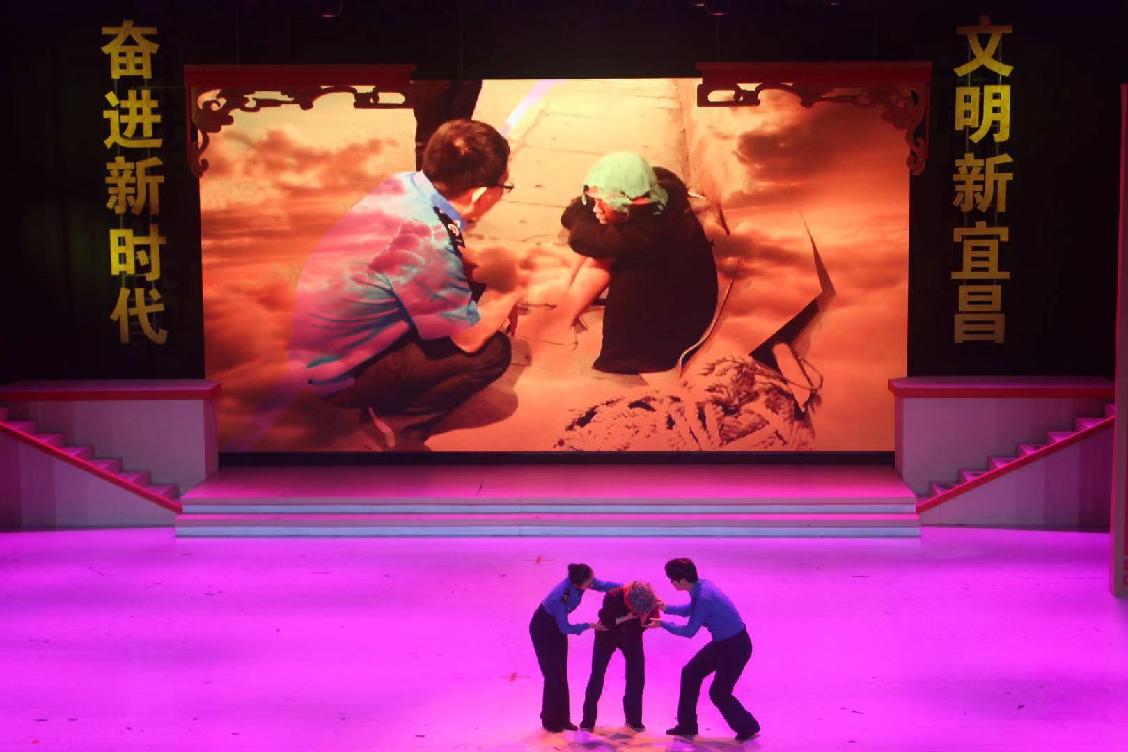 《幸福驿站》以走失26年的四川妇女罗碧琼的事例为背景,讲述了救助工作者救助流浪人员、帮助流浪人员回家团圆的事迹。展演现场,《幸福驿站》通过屏幕背景从冬雪冷冽到日出暖阳的转换、音乐背景从紧张到舒缓的渐变、流浪人员对救助工作者从排斥到信赖的心理变化,以及流浪人员早期困苦流浪与后期幸福团圆的强烈对比,真实再现了民政救助人的日常工作场景。来自市救助管理站、市殡葬管理所、市军用供应站、市烈士陵园的15名优秀文艺骨干,通过明显的情绪变化、丰富的肢体语言以及朴实真挚的情感转换向观众呈现了一帧民政救助工作者助人团圆的美好画面,赢得了观众的掌声与一致好评,充分展现了民政人初心为民、牢记爱民使命的良好形象。(宜昌市救助管理站)