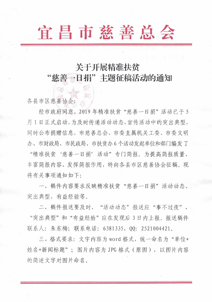 本网讯(通讯员 高金娥)为给《2019年精准扶贫“慈善一日捐”活动简报》提供素材,宜昌市慈善总会于5月10日发出通知,特向宜昌市各县市区慈善协会及社会各界征稿,以提高简报质量、丰富简报内容、发挥简报作用。