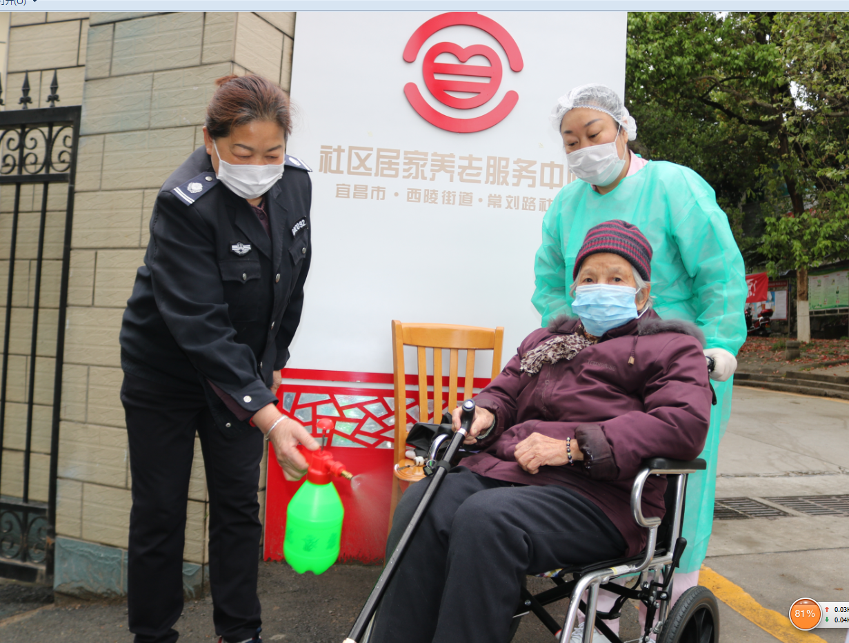 入口处,门岗人员对轮椅、老人脚底分别进行消毒。