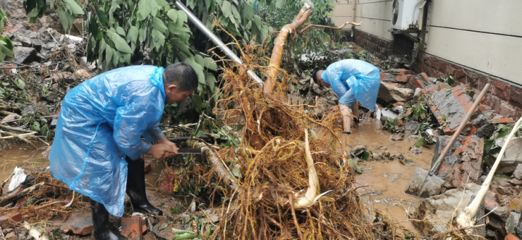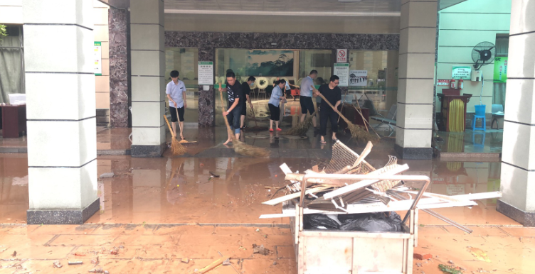 针对受灾情况,该所有针对性地制定防范应对措施,并立即组织相关人员进行灾后处置工作。针对万福厅后山塌方、厅内进水的问题,工作小组人员通力协作,迅速清理塌方处的泥石流和砖块,将下水道疏通排淤,清扫厅内积水,保障殡仪业务工作的正常运转;针对配电设施设备受损的情况,后勤科组织专人对电器、配电房等设施设备进行安全隐患排查,并在有隐患的地方设置“温馨提示”牌,确保不发送次生灾害……在灾后处置过程中,大家的鞋子早已灌满积水,浑身早已湿透,他们干脆卷起裤脚,依然不顾一切地在风雨中忙碌着。