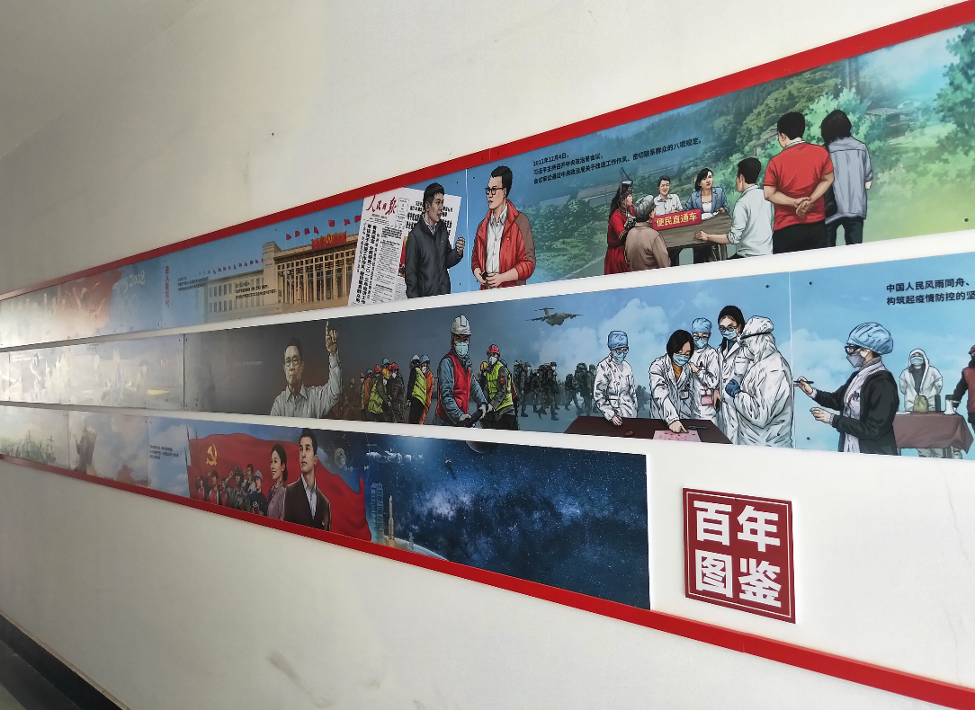 该所围绕人民日报推出的“百年图鉴”相关内容,将“党史文化长廊”建立在行政大楼三楼楼梯走道,在表现形式上力求“多样化”,通过图文并茂的形式,充分展示了中国共产党从1921年建党到改革开放以来的辉煌历程,开辟出红色文化宣传的新阵地。该“文化长廊”分为梦想起航、探索前行、艰苦斗争、改天换地、改革新貌、进入新时代六个部分,详细讲述了中国共产党百年为民族复兴、国家富强、人民幸福所做出的不懈努力和伟大成就。