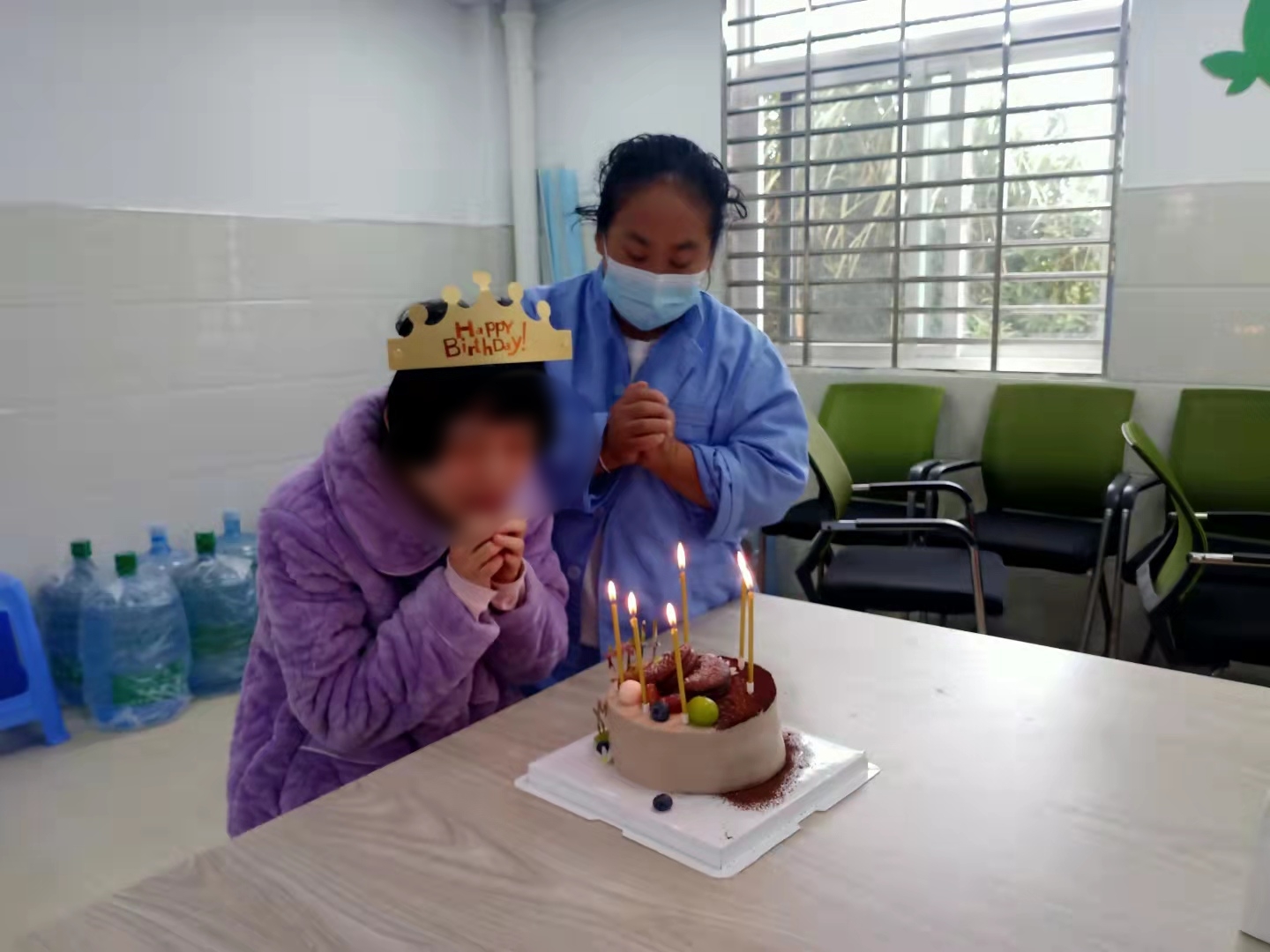 小雨的家人远在外地,无法陪在她身边一同庆祝生日。为了让小雨能够开心地度过生日,工作人员精心准备了蛋糕和生日帽,并通过视频通话的方式让小雨和家人面对面交流。最后,在家人的祝福和工作人员的生日歌中,小雨开心地闭上眼对着蛋糕上的蜡烛许愿,并在工作人员的帮助下将蛋糕一起分享给了其他服务对象。