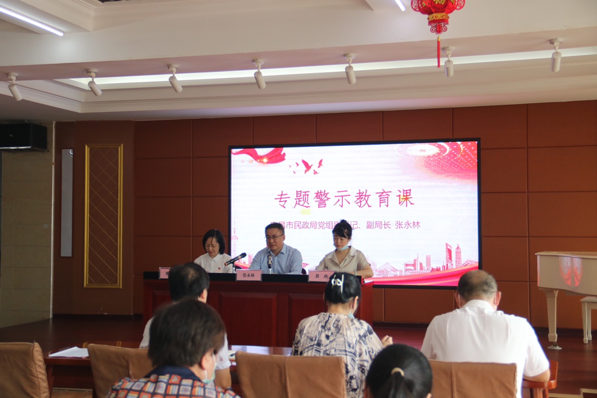 随后,市民政局党组副书记、副局长张永林向全员上“专题警示教育主题党课”。他指出,一是要提高认识,坚持管党治党严的主基调。要坚定不移推进全面从严治党,不断提升干部职工抓落实的能力水平,持续营造风清气正、干事创业的良好政治生态。二是要认清形势,仔细排查风险隐患。要切实加强对重点岗位、关键领域、重点环节的廉政风险排查,并结合工作实际,制定有效防控措施。三是要常抓不懈,抓实党风廉政建设。要强化责任落实、强化管理机制、加强支部建设,以党风廉政建设的有效成果助力全面从严治党抓紧抓实。他强调,广大民政党员干部职工要进一步筑牢拒腐防变的思想防线,永葆“赶考”的清醒和坚定,持续推动民政工作高质量发展,以优异成绩向党的二十大献礼。