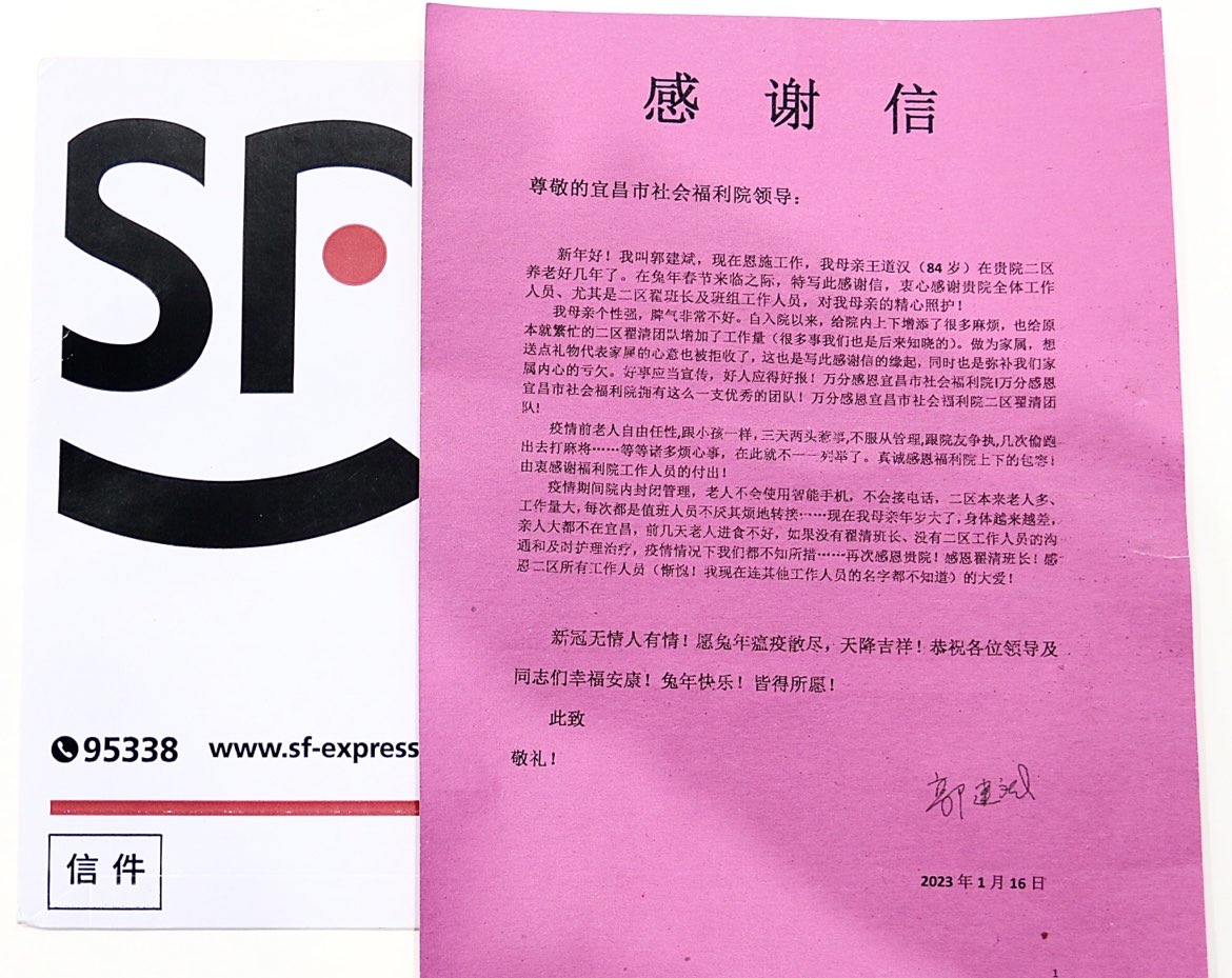 这是一封春节前夕寄出的信件,在最恰当的时机,送给最恰当的人,其含义不言而喻。在这封老人家属从外地顺丰快递邮寄过来的感谢信中,真实地记录了该院工作人员的付出。这群默默无闻不计辛劳的工作人员,用自己热情周到的服务为疫情当下的老人们提供无微不至的关怀和照护!