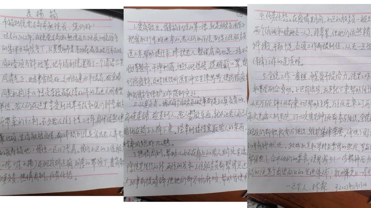 本网讯(通讯员 何书涵 罗雨)感谢和认可一直是人们持续前进的动力,长者的谢意更是弥足珍贵。近期,宜昌市社会福利院收到了多封感谢信。感谢信的呈现方式均有不同,有工工整整打印好的,有手写满满一大篇的。无论是用何种载体,在他们或流畅或朴实的字里行间总能看到“感谢”二字,总能感受到热忱情意。