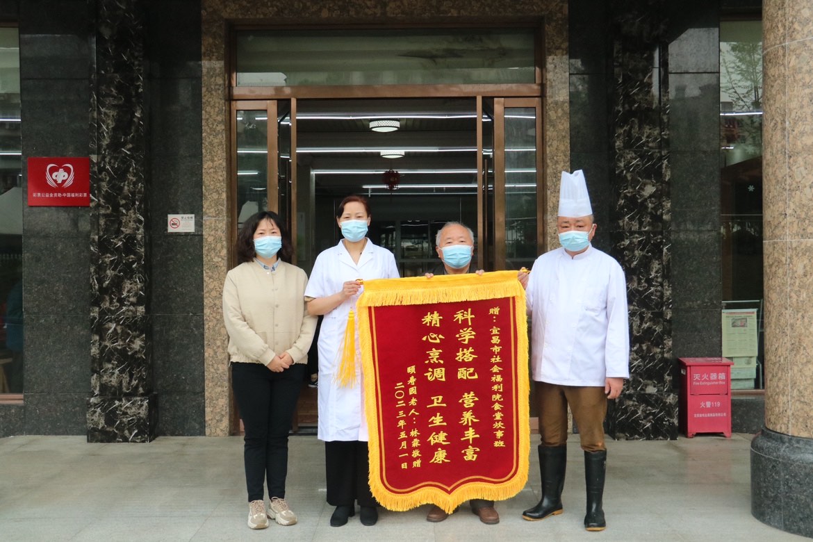 本网讯(通讯员 孙立忠 吴姝璇)“科学搭配营养丰富精心烹饪卫生健康”“全心全意爱岗敬业吃苦耐劳服务满意”,五一劳动节前夕,宜昌市社会福利院服务对象林爷爷分别向该院后勤服务部和老年服务部赠送一面锦旗,对工作人员给予亲人般的贴心照顾表示衷心感谢。