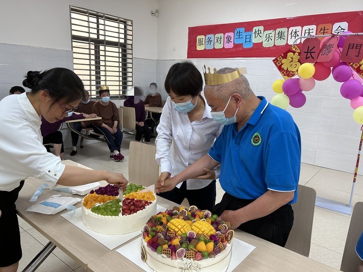 在优美动听的旋律声中,服务对象与工作人员一起围坐在蛋糕旁唱着《生日快乐歌》。“寿星们”许下心愿,吹灭蜡烛。随后,工作人员将切好的蛋糕送到每位服务对象手中。服务对象吃着甜甜的蛋糕,脸上洋溢着灿烂而又幸福的笑容。看着服务对象开心的笑容,工作人员也满脸欣慰。