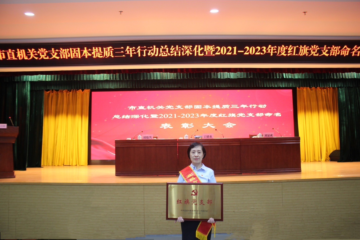 本网讯(通讯员 陶嘉欣)6月30日,市直机关党支部固本提质三年行动总结深化暨2021-2023年度红旗党支部命名表彰大会在宜昌市委党校召开,宜昌市社会福利院党支部被宜昌市委直属机关工委授予“红旗党支部”荣誉称号,党支部书记、院长熊长英参加大会并代表党支部接受表彰。