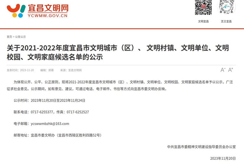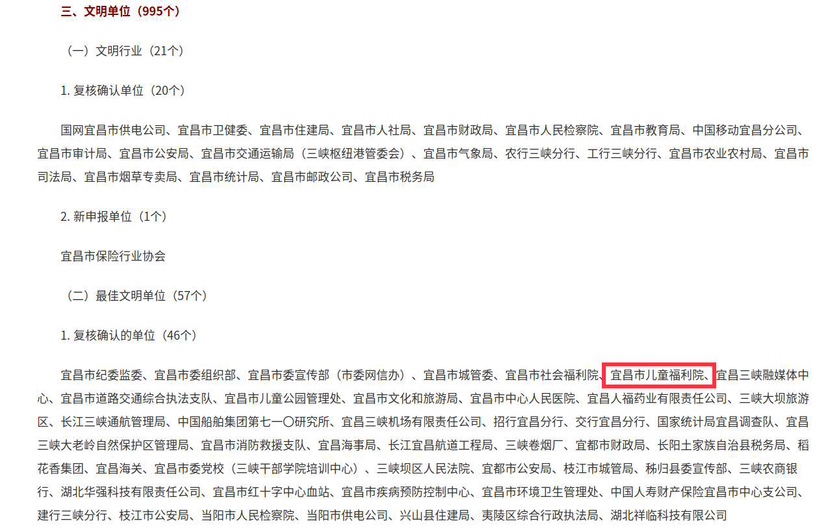 本网讯(通讯员 陈婕)近日,宜昌市委文明办《关于2021-2022年度宜昌市文明城市(区)、文明村镇、文明单位、文明校园、文明家庭候选名单的公示》公布,宜昌市儿童福利院作为复核确认单位被列为“最佳文明单位”。