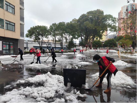 2月3日至4日,该院党员干部带头,全时上阵,周末不停歇,参与职工达50余人,清扫出了50余亩道路面积。在党支部书记、院长熊长英的带领下,迅速集结,明确分工任务,拿着铁锹、扫把,扫积雪、铲冰层。他们冲在前、干在先、战严寒、斗冰雪,干得热火朝天,忙碌的身影映衬着红色的马甲,在冬天凛冽的福园中构成了一道靓丽的风景线。经过共同努力,积雪得到及时清理,保障了道路的整洁畅通和服务对象的出行安全,顺利完成除冰清雪任务。