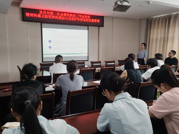 本网讯(通讯员 杨德琴)7月26日下午,宜昌市第二社会福利院组织全体干部职工,围绕《精神科暴力防范和沟通技巧》及《保护性约束的注意事项》两大主题,开展了一场独具特色的专业培训,旨在进一步提升工作人员的专业素养与应急处理能力,为精神障碍服务对象提供更加安全、有效的照护环境。