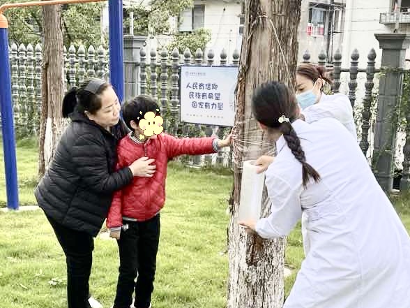 活动在欢快的音乐氛围中拉开序幕,孩子们带上装备迫不及待地来到大树旁,在康复师的帮助下,他们迅速投入到为大树装扮的活动中。有的孩子利用保鲜膜为树干缠裹上一层透明的保护层,仿佛为大树披上了一袭亮丽的外衣。随后,他们拿起马克笔,在保鲜膜上尽情挥洒创意,将大树装点得五彩斑斓,充满生机。而另一些孩子则选择用五颜六色的旧衣物为大树包裹上温暖的“棉袄”,他们一圈又一圈地缠绕着毛线,确保衣物能够牢固地附着在树干上,抵御冬日的寒风。现场气氛热烈而有序,孩子们忙得不亦乐乎。