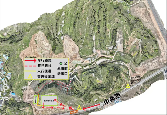 自驾车辆需沿中南路行驶,依照交通提示牌指引,到达祭扫进出口(B353 专线黑虎山村站向前 500 米处),按照红色箭头所示的车行路线行驶,抵达临时停车区域停车。沿着黄色箭头所示的人行便道前行,按照红色虚线标注的祭扫路线,前往墓地进行祭扫。